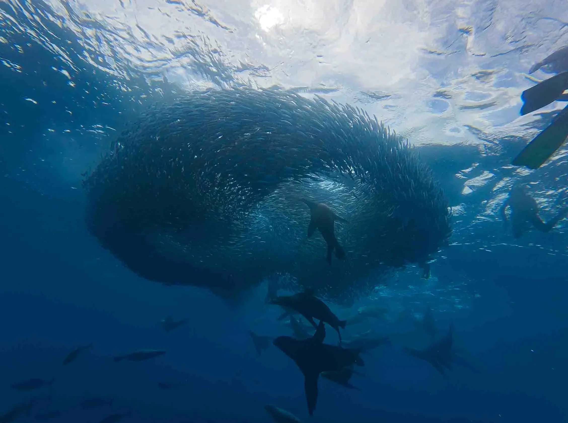 Fast paced bait ball action as spawning sardines attract hungry sea lions, dolphins, marlins, and whales.