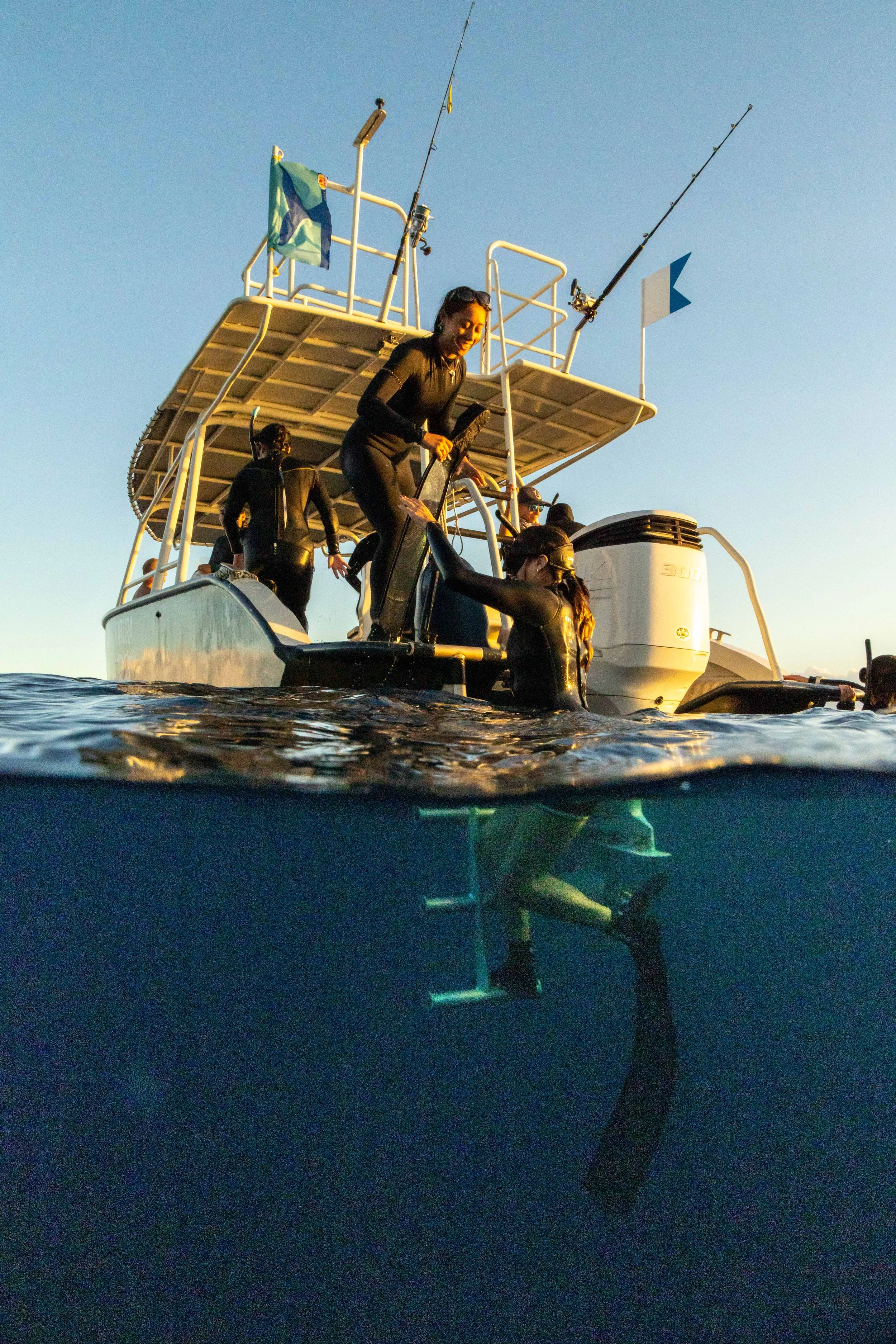 This is a snorkeling/freediving trip—no scuba. You need to be comfortable swimming at least 200 metres unaided in open water and able to pull yourself back onto the boat (flat platform on the back). Freediving experience is welcome but not required. The focus is slow, quiet encounters at the surface.